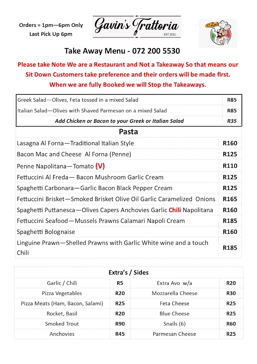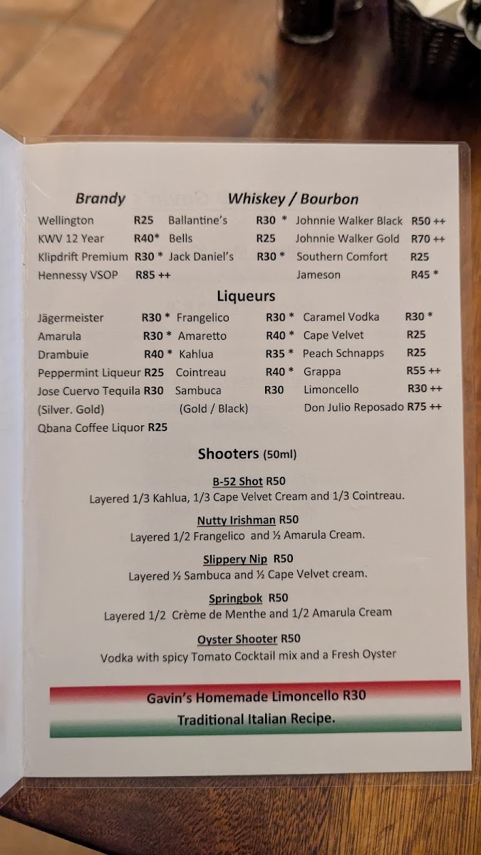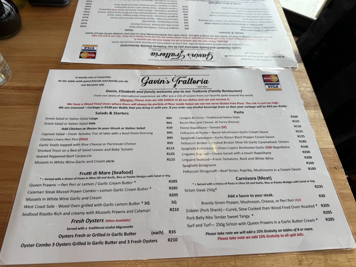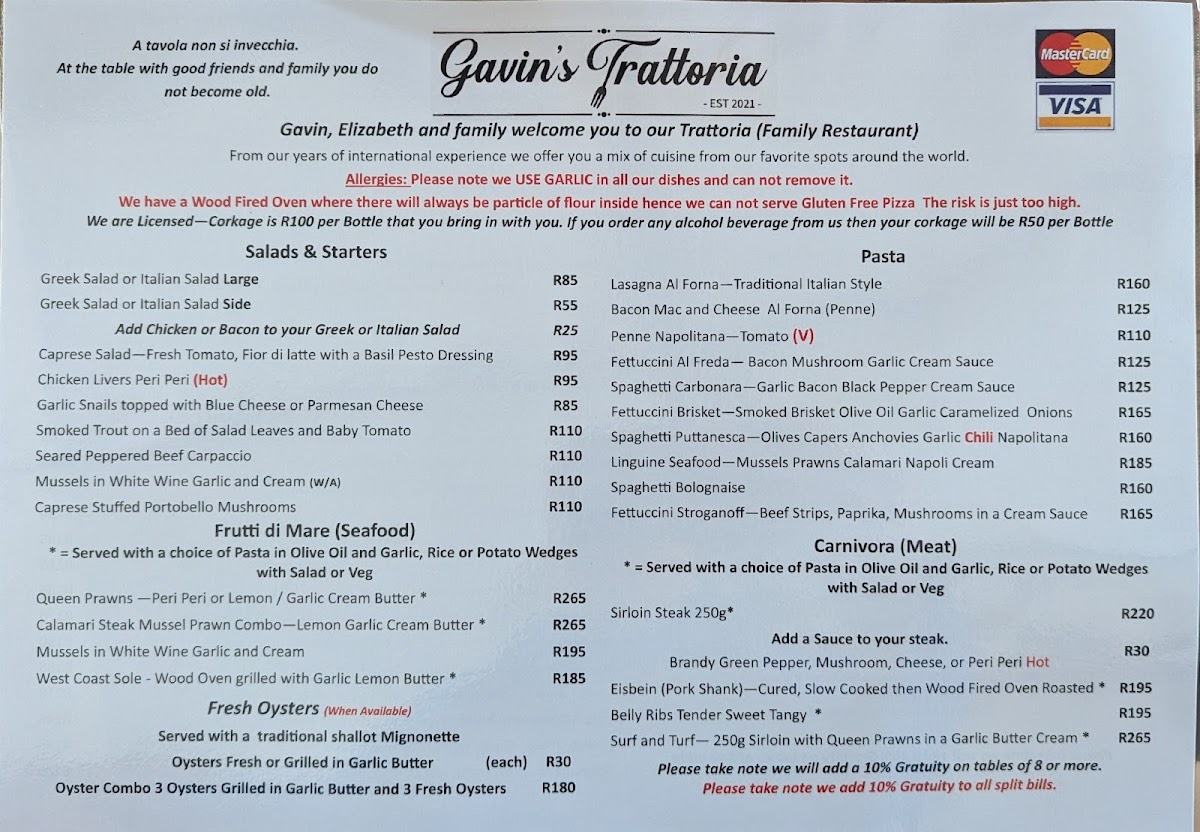 Gavin's Trattoria Agulhas Restaurant Menu