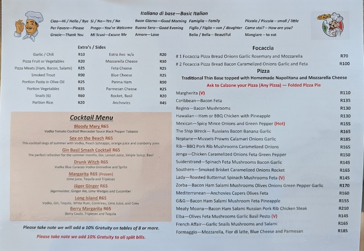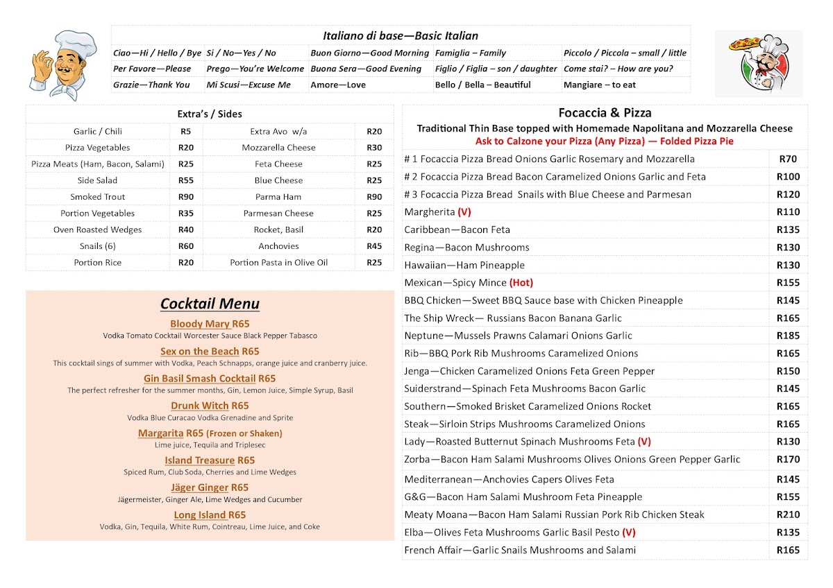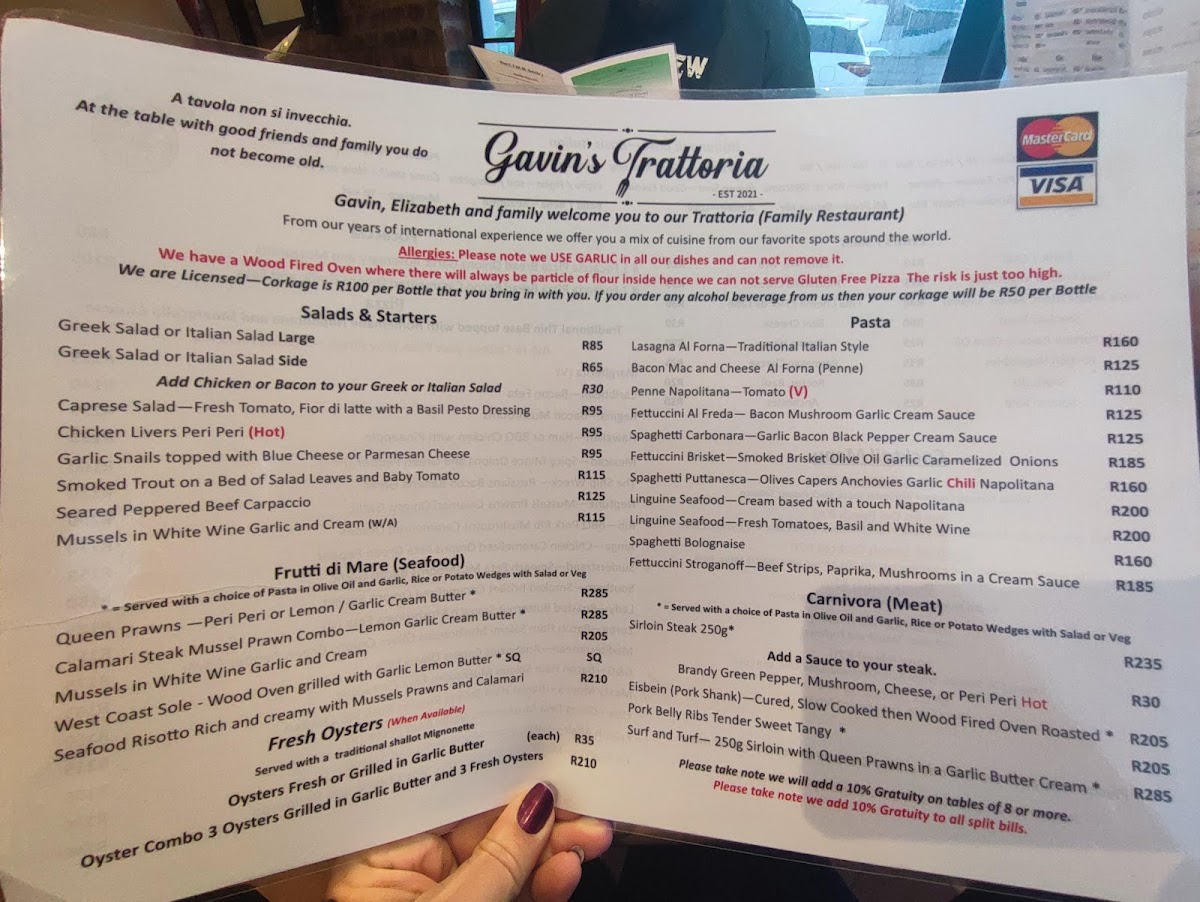 Gavin's Trattoria Agulhas Restaurant Menu